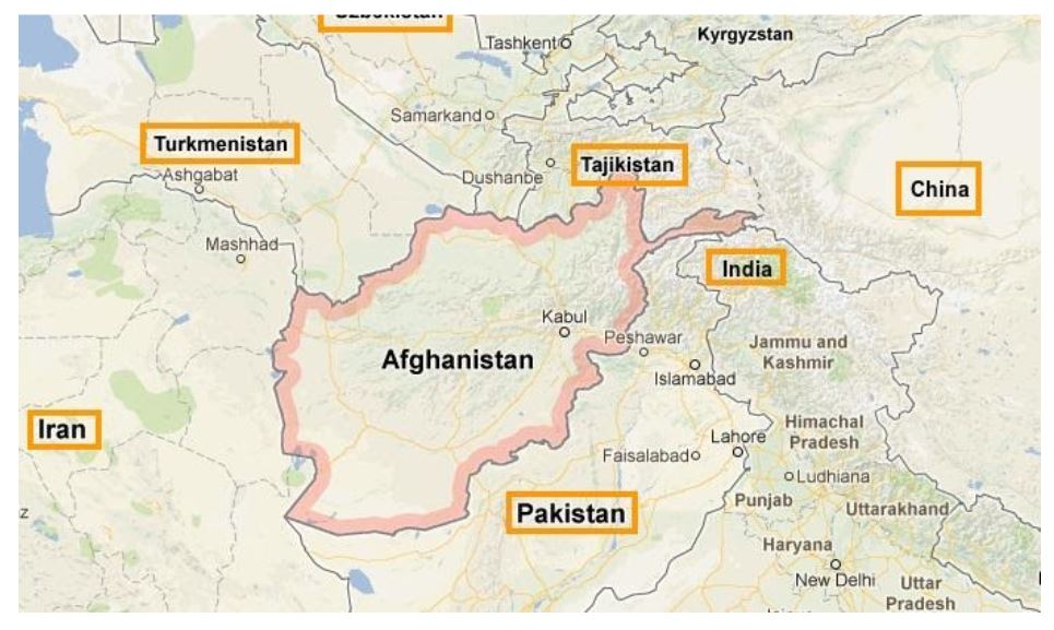 - अफगानिस्तान की सीमाएँ उत्तर में ताजिकिस्तान, तुर्कमेनिस्तान और उज्बेकिस्तान, पश्चिम में ईरान, पूर्व और दक्षिण में पाकिस्तान से लगती हैं।